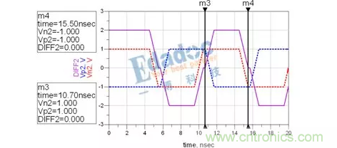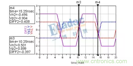 可以看到,兩次經(jīng)過零軸的時(shí)間由之前的5ns變成了4.8ns?;蛘哒f,N與P的長度差,引起了0.04UI的抖動(dòng)。這時(shí)候,串行的Clock recovery該花點(diǎn)心思才能將其時(shí)鐘解出來了。而且在進(jìn)行時(shí)鐘與數(shù)據(jù)對(duì)位的時(shí)候,是對(duì)在0V這個(gè)階梯的左邊還是對(duì)在右邊呢?這又會(huì)引起時(shí)序問題的出現(xiàn)。