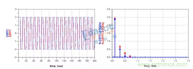 圖中,藍(lán)色的是N與P不等長的信號(hào),可以看到,當(dāng)兩線不等長的時(shí)候,差分信號(hào)的能量明顯變?nèi)趿?,那多的能量去哪里了呢?/div>