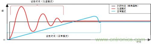 當旋轉(zhuǎn)變壓器的電機位置或輸出信號變化迅速時,穩(wěn)定時間是RDC控制系統(tǒng)的快速性能指標[2]。圖1顯示的一個是有階躍輸入變化(黑線)的RDC反饋控制系統(tǒng)的穩(wěn)定時間的例子。藍色信號顯示的是對電路的正常模式響應,紅色信號顯示的是加速模式過程中響應(角快速變化)。為了在快速變化的條件下追蹤到旋轉(zhuǎn)角,加速模式幫助控制回路很容易跟蹤到一個快速的旋轉(zhuǎn)角[4]。