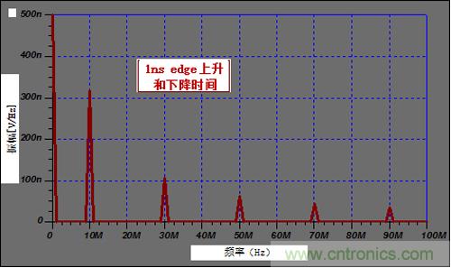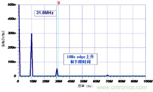 根據(jù)該公式,10nsEdge Rate對應的諧波頻率大約為31.8MHz。圖3顯示:最后一個重要的諧波頻率為30MHZ。同時,1ns的Edge Rate對應的諧波頻率318MHZ(圖2)。如果頻率范圍擴展到300MHZ以外,顯示的諧波仍很明顯,但卻在相關(guān)頻率上迅速變小。