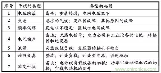 造成電磁干擾復(fù)雜性(特別電源線干擾的復(fù)雜性)的第二個(gè)原因是干擾表現(xiàn)的形式很多,可以從持續(xù)期很短的尖峰干擾直至電網(wǎng)完全失電。其中也包括了電壓的變化(如電壓跌落、浪涌和中斷)、頻率變化、波形失真(包括電壓和電流的)、持續(xù)噪聲或雜波,以及瞬變等等。下表是經(jīng)??梢砸?jiàn)到的干擾類型和它們的起因: