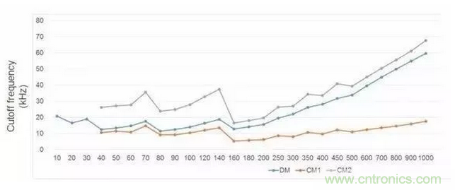 這張圖給出了不同頻率下共模和差模濾波器轉(zhuǎn)折頻率的關(guān)系,可以看出,一些低頻點(diǎn)EMI濾波器體現(xiàn)出了非常好的特性。例如70Khz,140Khz。而這兩個(gè)開(kāi)關(guān)頻率是工業(yè)界常用的兩個(gè)開(kāi)關(guān)頻率,非常討巧,因?yàn)镋MI噪聲測(cè)試是150KHz到30MHz。不過(guò)這個(gè)也與拓?fù)溆嘘P(guān)。