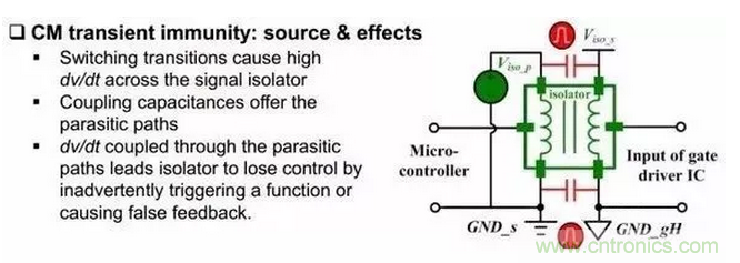 同時(shí)選隔離芯片的時(shí)候也需要注意一個(gè)參數(shù)叫做CM transient immunity(肯定會(huì)給的),這個(gè)參數(shù)最好大于開(kāi)關(guān)瞬間,橋臂中點(diǎn)電平的變化速率。光耦隔離這個(gè)參數(shù)一般在30kV/us,磁耦在35kV/us,電容耦合在50kV/us(是不是絕望了,都比氮化鎵低,硅器件一般在10kV/us,Sic 30kV/us)。