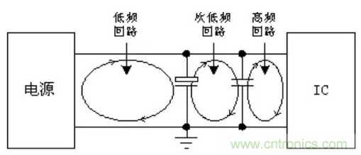 電路板入口處的電源去耦:大多數(shù)電路板的電源入口處去耦包括一個(gè)大的去耦電解電容并一到兩個(gè)小的高頻去耦電容,主要作用是為數(shù)字電路提供再充電,同時(shí)減少高頻噪聲。
