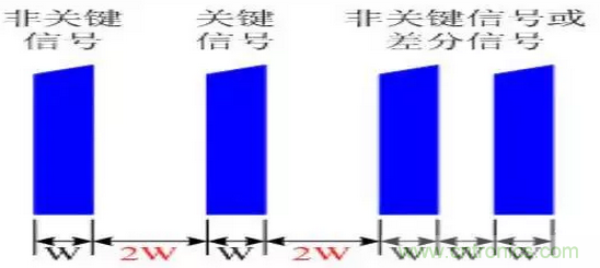 4、時(shí)鐘線、總線、射頻線等關(guān)鍵信號(hào)走線和其他同層平行走線應(yīng)滿足3W原則。