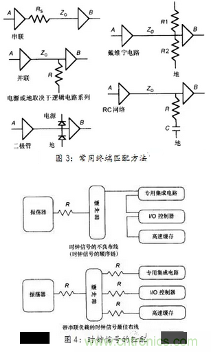 為了抑制出現(xiàn)在印制線終端的反射干擾,除了特殊需要之外,應(yīng)盡可能縮短印制線的長度和采用慢速電路。必要時可加終端匹配。終端匹配方法比較多,常見終端匹配方法見圖3所示。根據(jù)經(jīng)驗,對一般速度較快的TTL電路,其印制線條長于10cm以上時就應(yīng)采用終端匹配措施。匹配電阻的阻值應(yīng)根據(jù)集成電路的輸出驅(qū)動電流及吸收電流的最大值來決定。時鐘信號較多采用串聯(lián)匹配,見圖4所示。