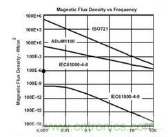 下圖比較了ADI的ADuM1100(磁隔離)和TI 的ISO72x(電容式隔離)的磁場抗擾度,雖然兩個例子在限定磁場下都不太受磁場影響,但I(xiàn)SO72x對磁場抗擾度有更好的表現(xiàn)。