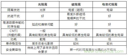 無論是光隔離、磁隔離或是電容式隔離,只要在適當(dāng)?shù)臈l件下工作都可以達(dá)到很出色的隔離效果。下圖是一個三種隔離技術(shù)的簡單比較: