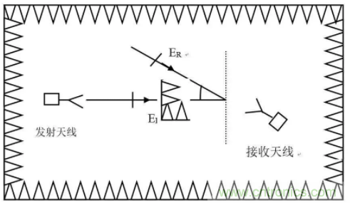 測試近場工作區(qū)反射電平時,發(fā)射天線先置于暗室中心軸線上,接收天線置于正對被測墻壁的一個合理位置,并沿兩天線軸線移動一段距離進行反射電平的測試。測試位置如圖所示。