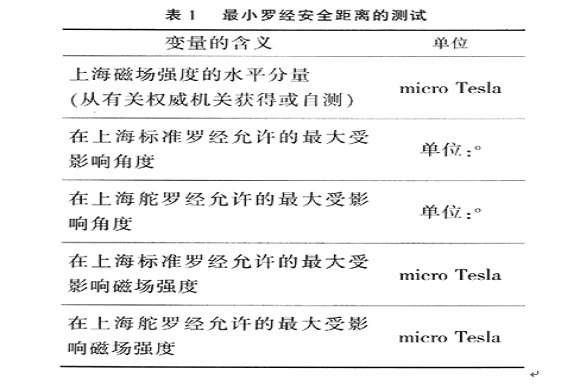 羅經(jīng)最小安全距離的測(cè)試方法是利用地球磁場強(qiáng)度與角度的關(guān)系,將對(duì)角度的測(cè)量轉(zhuǎn)化為對(duì)磁場強(qiáng)度的測(cè)最。在上海地區(qū)的測(cè)試方法如表1所示。