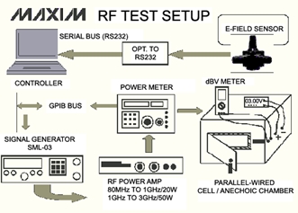 Maxim的RF測試裝置(圖2)產(chǎn)生用于測試RF抗干擾能力的RF場。測試電波暗室具有一個(gè)屏蔽室,作用與法拉第腔的屏蔽室類似,具有連接電源和輸出監(jiān)視器的端口。把下面列舉的設(shè)備連接起來就可以組成測試裝置: