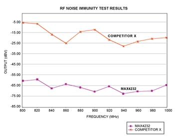 而器件X的噪聲抑制平均讀數(shù)僅有-18dBV,這意味著在RF影響下輸出變化為125mVRMS (相對于1V)。這個(gè)增加值很大,是正常值50µVRMS的2500倍。因此,器件X的RF抗干擾能力很差(-18dBV),當(dāng)靠近蜂窩電話或其它RF源時(shí)可能無法正常工作。顯然,對于音頻處理應(yīng)用如耳機(jī)放大器和話筒放大器,MAX4232是一個(gè)更好的選擇。