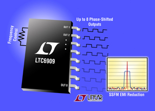 凌力爾特公司 (Linear Technology Corporation) 推出精確硅振蕩器LTC6909,該器件極大地降低了峰值輻射 EMI,并在多相電源中改善了開關(guān)穩(wěn)壓器的控制。LTC6909 有 8 個獨(dú)立輸出,提供多達(dá) 8 個軌至軌 50% 占空比時鐘信號。這些輸出可以用來啟動或禁止以及實(shí)現(xiàn)多個開關(guān)穩(wěn)壓器的相位同步。相位同步提供多種設(shè)計優(yōu)勢,包括改善的 EMI 性能、降低的輸入和輸出紋波電流、以及更好的負(fù)載瞬態(tài)響應(yīng)。使用 3 個邏輯輸入,這些輸出之間的相位關(guān)系可以從 45o 至 120o 配置,或者輸出可以被置于邏輯低或高 Z 狀態(tài)。