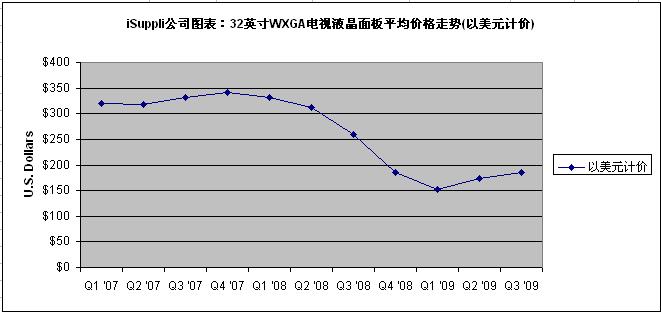 附圖所示為iSuppli公司對于2008年10月至2009年第四季度結(jié)束時(shí)32英寸WXGA TV LCD面板市場的價(jià)格預(yù)估。這種面板價(jià)格可以體現(xiàn)出整體市場趨勢。