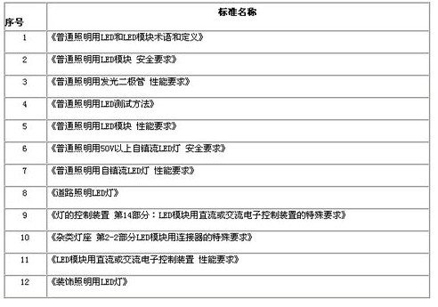 標(biāo)準(zhǔn)的目的在于加強(qiáng)生產(chǎn)的一致性、提升質(zhì)量、并增進(jìn)生產(chǎn)效率,若欲提升LED的制造質(zhì)量,在全球化的競爭脫穎而出,標(biāo)準(zhǔn)是一項(xiàng)不可或缺的工具,因此加速對LED標(biāo)準(zhǔn)的制定是各國政府及業(yè)界非常重視的問題。2007年在半導(dǎo)體照明標(biāo)準(zhǔn)工作指導(dǎo)委員會的指導(dǎo)下,由“國家半導(dǎo)體照明工程研發(fā)及產(chǎn)業(yè)聯(lián)盟”成立“聯(lián)盟標(biāo)準(zhǔn)化協(xié)調(diào)推進(jìn)工作組”,以負(fù)責(zé)協(xié)調(diào)中國的LED標(biāo)準(zhǔn)進(jìn)度。而目前最新進(jìn)展是由“全國照明電器標(biāo)準(zhǔn)化技術(shù)委員會”提出的普通照明用LED國家標(biāo)準(zhǔn)及行業(yè)標(biāo)準(zhǔn)等10多項(xiàng)標(biāo)準(zhǔn)目前都在送審階段,預(yù)計于今年陸續(xù)頒布實(shí)施,如表所示。