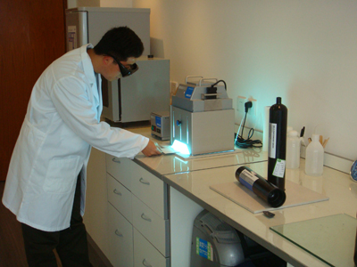 德路上海代表處首席代表 Torsten Uske說到:“我們利用自己的實驗室和各類設備能夠對大部分客戶樣品直接進行現(xiàn)場測試,這樣就不必把樣品發(fā)往德國。” Torsten Uske和他的團隊將在實驗室對客戶的應用進行諸如可行性研究。除了在揚聲器和手機領域的粘接外,和顯示器相關的粘接實驗也將在此進行。我們實驗室配備有各類設備,包括溫度測量儀、光強測量儀、固化燈、點膠設備以及涂膠用的絲網(wǎng)印刷模版。