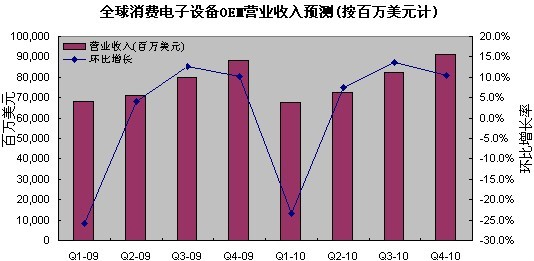 下圖所示為iSuppli公司對于各季度全球消費電子設備營業(yè)收入的預測。