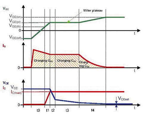 正如IG=f(t)圖所示,導通過程可以分為三個階段。分別是柵極-發(fā)射極電容的充電,柵極-集電極電容的充電和柵極-發(fā)射極電容的充電直至IGBT全飽和。柵極電流IG對輸入電容進行充電,IGBT的導通和關斷特性由與充電過程有關的電壓VGE和VCE來體現(xiàn)。在關斷期間,所描述的過程運行在相反的方向,電荷必須從柵極上移除。