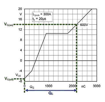 總的刪極-發(fā)射極電壓可通過考慮所施加的柵極導通電壓VG(on)和關斷電壓VG(off)之差來進行計算。圖3中來自IGBT數(shù)據(jù)表的圖表顯示了在正象限和負象限的柵極電荷曲線。如果柵極電荷曲線只在正象限給出,則柵極電荷的幅值可由外插法讀出。即使在沒有柵極電荷曲線的情況下,通過使用輸入電容Cies=CGE+CGC這一準確度稍差的方法也能確定柵極電荷。
