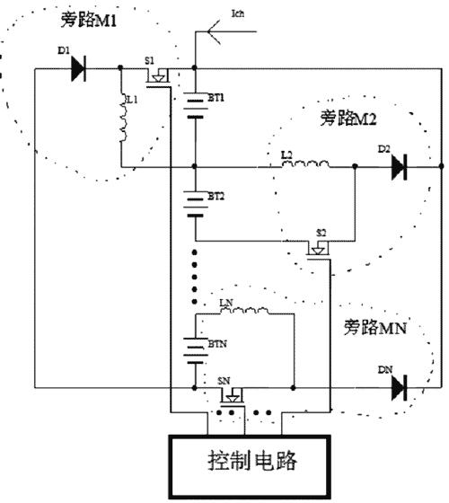 4.運(yùn)用分時(shí)原理,通過開關(guān)組件的控制和切換,使額外的電流流入電壓相對較低的電池中以達(dá)到均衡充電的目的。該方法效率比較高,但控制比較復(fù)雜。