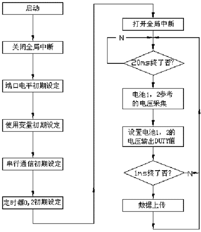為了驗(yàn)證本文的均衡充電方法,以兩節(jié)單體電池組成的蓄電池組為例進(jìn)行實(shí)驗(yàn)和分析,主要驗(yàn)證旁路中開關(guān)管對電壓的調(diào)節(jié)作用??刂屏鞒桃妶D4。