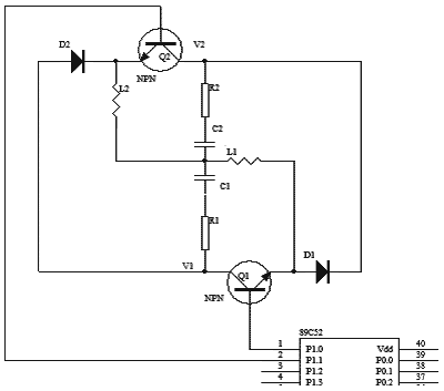 本實(shí)驗(yàn)中,選用兩個(gè)小功率NPN管C1815(Q1、Q2)來替代開關(guān)管,用89C51芯片的P1.0和P1.1腳控制Q1、Q2的開關(guān)。同時(shí),蓄電池的端電壓V1和V2由差動(dòng)放大電路采集,經(jīng)A/D轉(zhuǎn)換送到CPU。在整個(gè)過程中,電壓每20ms采樣一次,每隔1s上傳上位機(jī)并保存并自動(dòng)繪制曲線。圖5為試驗(yàn)電路圖。