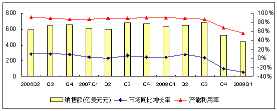 圖 2006Q2-2009Q1全球半導體市場規(guī)模和能利用率