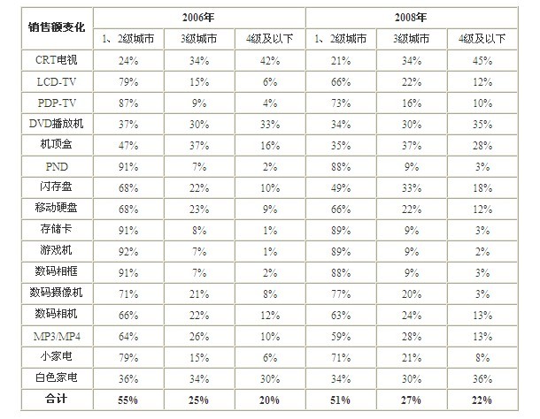 表1 2006年與2008年中國主要消費電子終端產品不同級別城市銷售額結構變化