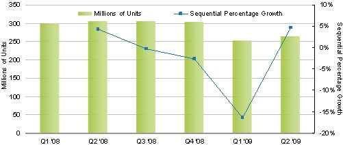據(jù)iSuppli公司,第二季度全球手機(jī)出貨量比第一季度增長(zhǎng)4.7%,這是自2008年第三季度以來(lái)首次出現(xiàn)環(huán)比增長(zhǎng)。第二季度全球手機(jī)出貨量為2.65億部,而第一季度是2.53億部。