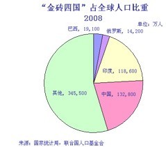 圖1:2008年金磚四國占全球人口比重。數(shù)據(jù)來源:中國國家統(tǒng)計局,聯(lián)合國人口基金會