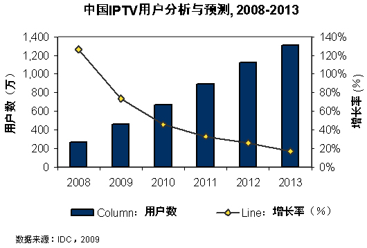 在未來幾年中,可以預(yù)見,無論是出于集團利益還是內(nèi)容監(jiān)管的需要,對IPTV的監(jiān)管不會有本質(zhì)的顯著改變,中國IPTV仍將在一段時期內(nèi)處于非完全市場化的發(fā)展和競爭狀態(tài),但是隨著產(chǎn)業(yè)環(huán)境的完善和消費者認(rèn)知和接受程度的提高,IPTV的用戶規(guī)模必將穩(wěn)步擴張。IDC預(yù)計,2009年中國IPTV用戶將達(dá)到460萬,同比增長73.6%,2013年將達(dá)到1310萬用戶的規(guī)模。在這個過程中,已經(jīng)將IPTV定位為未來戰(zhàn)略轉(zhuǎn)型業(yè)務(wù)的電信運營商和尋求新媒體發(fā)展機遇的內(nèi)容運營商,將需要通過更加專業(yè)細(xì)分的內(nèi)容整合、更加關(guān)注用戶體驗的營銷策略,來驅(qū)動市場的進一步發(fā)展。