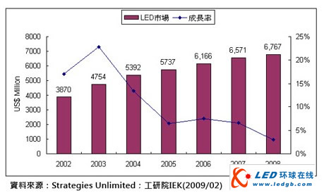 由于需求減緩,難以消耗年初所擴(kuò)增產(chǎn)能,導(dǎo)致產(chǎn)品單價巨幅的向下變動,整體市場景氣由繁榮轉(zhuǎn)為衰退,所幸上半年市場成長,抵銷部分下半年市場衰退負(fù)面影響,2008年全球LED市場較2007年微幅成長3%,達(dá)67.6億美元,詳如圖一所示。