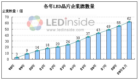 - 至2009年8月現(xiàn)存LED芯片生產(chǎn)企業(yè)達62個