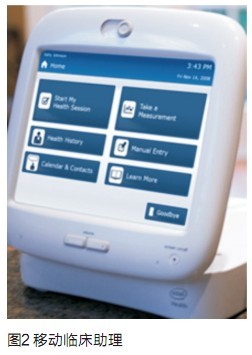 其次是醫(yī)療信息化產(chǎn)品,比如上海交大生物醫(yī)學工程研究所開發(fā)的生命體征監(jiān)測無線服務(wù)平臺。平臺的核心就是一個多參數(shù)體征測量儀(iCare)、GSM模塊和網(wǎng)絡(luò)、智能分析軟件和服務(wù)器,可以部署在社區(qū)和醫(yī)院,這樣類似的系統(tǒng)國內(nèi)已經(jīng)成功地應(yīng)用在工業(yè)控制中了,只要把多參數(shù)體征測量儀設(shè)計完善好,系統(tǒng)構(gòu)建和實施難度不大。再如,Intel公司的移動臨床助理(Mobile Clinical Assistant)(如圖2),核心是Intel 高性能、低功耗移動便攜系統(tǒng)方案,可以很方便地布置在醫(yī)院病房、病人家里和醫(yī)生的診所,經(jīng)過專業(yè)醫(yī)療儀器廠家的定制和生產(chǎn),裝置已經(jīng)完全符合醫(yī)療上的密封、消毒和安全的要求。國內(nèi)嵌入式系統(tǒng)企業(yè)應(yīng)該完全有能力設(shè)計出類似的裝置,而且如果采用國產(chǎn)ARM SoC 方案,體積還能更小,價格更便宜,功耗還能低。