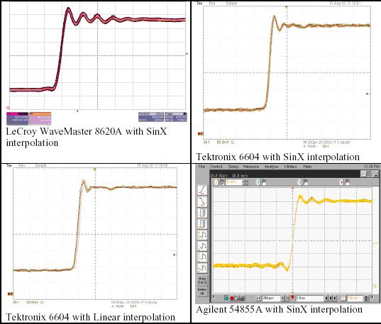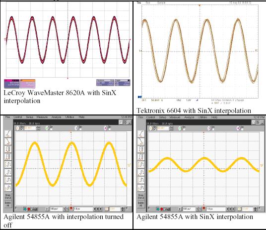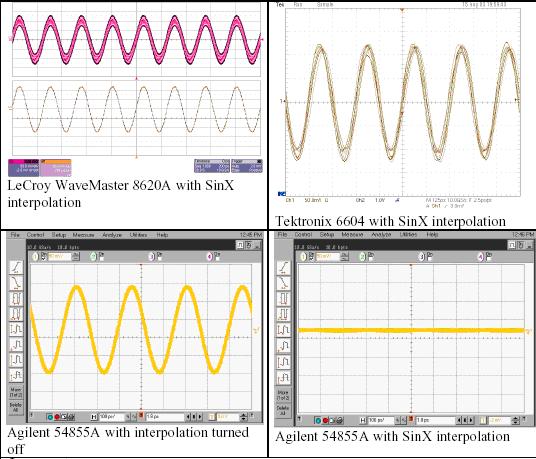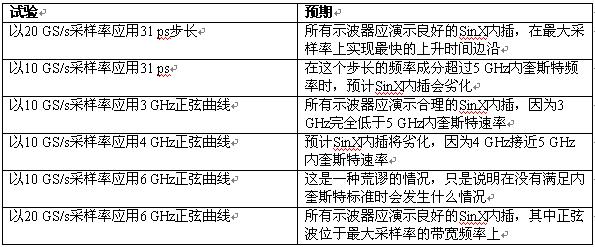 我們使用三種競爭的DSO進行簡單的試驗,其分別是力科Wavemaster 8620A、泰克6604和安捷倫54855A。這三種示波器的帶寬指標(biāo)都是6 GHz,最大采樣率是20 GS/s。我們使用六種不同的信號和采樣率組合,說明SinX內(nèi)插算法的性能。