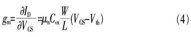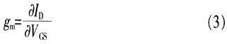通過式(2)得到如圖2所示的MOS晶體管等效電路,其中壓控電流源gmVgs是模型中最重要的部分,晶體管的跨導(dǎo)gm定義為:
