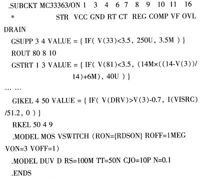 語句GSUPP34VALUE={IF(V(33)<3.5,250U,3.5M)},表示節(jié)點(diǎn)33和節(jié)點(diǎn)3、4之間連接的模塊實(shí)現(xiàn)當(dāng)輸入端33節(jié)點(diǎn)的電壓小于3.5V時(shí),輸出端節(jié)點(diǎn)3和節(jié)點(diǎn)4之間的電壓為250μF,否則為3.5mV。該網(wǎng)格表使用到的EVALUE和GVALUE器件是將輸出量和輸入量之間運(yùn)算函數(shù)關(guān)系用語句表示。EVALUE和GVALUE稱為模擬行為模型(ABM)器件,除了這兩個(gè)外還有:*SUM、*MULT、*TABLE、ABS、LOG等,帶有“*”符號(hào)的元器件,有E、G兩種類型。使用ABM器件可省去實(shí)現(xiàn)這些換算的電路,簡(jiǎn)化子電路建模的工作量。