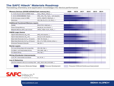 今年七月,在舊金山舉行的 Semicon West 展會上,我們針對硅半導(dǎo)體基底的化學(xué)氣相沉積 (CVD) 和原子層沉積 (ALD) 工藝公開了新的材料發(fā)展規(guī)劃。 規(guī)劃(圖 1 )概述了當前及未來先進的存儲和邏輯設(shè)備的發(fā)展道路,包括阻擋層、互連、介電材料和金屬,我們預(yù)期逐步推出,直至 2014 年完成。