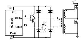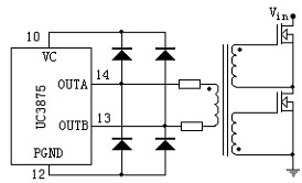 在驅(qū)動(dòng)小功率的MOSFET和IGBT時(shí),如果控制芯片的驅(qū)動(dòng)信號(hào)是圖騰柱輸出方式,且可提供一定的驅(qū)動(dòng)電流,那么可以直接由控制芯片來驅(qū)動(dòng)變壓器,如圖1所示: