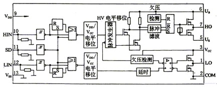 在大功率應(yīng)用場(chǎng)合,由于上述驅(qū)動(dòng)電路受驅(qū)動(dòng)能力的限制,無法可靠地驅(qū)動(dòng)大型MOSFET、IGBT。而集成驅(qū)動(dòng)器的出現(xiàn)則很好地解決了這一問題。國內(nèi)外已推出了多種具有保護(hù)功能的智能驅(qū)動(dòng)器,如日本產(chǎn)的EXB841、EXB850,國產(chǎn)的M57959和CWK等。它們具有許多優(yōu)點(diǎn),如電路參數(shù)一致性好、運(yùn)行穩(wěn)定可靠、具有多種保護(hù)功能等。但它們最大的不足是需要單獨(dú)的浮地電源,給系統(tǒng)帶來了不便。最近IR公司推出了IR2110集成驅(qū)動(dòng)器,它針對(duì)上述驅(qū)動(dòng)器電源系統(tǒng)的不足,設(shè)置了自舉浮動(dòng)電源,只需一路電源即可實(shí)現(xiàn)隔離驅(qū)動(dòng)。對(duì)半橋、全橋式電路特別適用。IR2110的功能框圖如圖3所示。