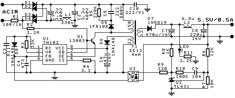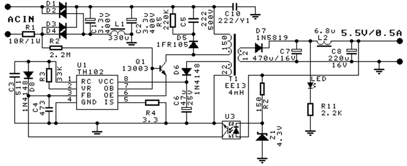 TH102采用穩(wěn)壓管、光耦發(fā)光管(圖2中Z1、U3、RZ)為輸出電壓基準,RZ基于光耦發(fā)光管壓降為Z1提供基電流,改變該基電流(既改變RZ)可小幅改變Z1穩(wěn)壓值,因此,若需較高精度輸出電壓可調校RZ,調校RZ可采用成批穩(wěn)壓管分為幾檔,每檔穩(wěn)壓管對應一個RZ;或TH102采用TL431(圖3中U2、R6、R7、R8、R9、R10、C9)電路為輸出電壓基準,基準精度較高和無需調校。TH102采用光耦隔離反饋電路(圖2中Z1、U3、RZ、C4,圖3中U2、R6、R7、R8、R9、R10、C9、C4)。