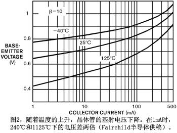 熱與冷都會對電路造成負(fù)面影響。在極高溫下,芯片可能燒毀(圖1)。更常見的情況是,如果你的設(shè)計達(dá)到未曾預(yù)料的溫度,很多部件都可能超出規(guī)定極限。當(dāng)出現(xiàn)這種情況時,電路就可能表現(xiàn)出難以預(yù)料的行為。另外一個情況也同樣值得關(guān)注,即電路溫度從熱到冷,然后又從冷到熱。這種狀況會造成熱沖擊,也會毀壞元件。很多工程師并不關(guān)心自己的電路在低溫下的性能,但這種忽視是一個錯誤。半導(dǎo)體器件的性能在低溫下會發(fā)生顯著變化。雙極晶體管的基射結(jié)電壓在低溫下會大大升高(圖2和參考文獻1)。AnalogDevices產(chǎn)品開發(fā)工程經(jīng)理FranciscoSantos說:“如果你要設(shè)計一個能夠在負(fù)溫度下工作于1.8V的放大器,就要考慮當(dāng)從室溫降到-40℃時,VBE(基射電壓)會增加130mV。這種情況將迫使設(shè)計者采用一組完全不同的放大器架構(gòu)。”