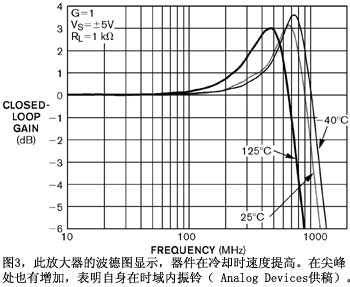 很多放大器,如AnalogDevices的AD8045,在冷卻時會加速(圖3),而有些放大器(如AD8099)則在變冷時會降速。已退休的LinearTechnology信號處理產(chǎn)品前副總裁兼總經(jīng)理BillGross稱:“雙極晶體管在低溫下遇到的多數(shù)麻煩是低電壓工作。”他認(rèn)為,較高的基射電壓和較小的電流增益都更難于滿足規(guī)格要求。他說:“較低的輸入阻抗和b(電流增益)的不匹配都會造成低溫下的大問題。尤其是當(dāng)它們?yōu)槭覝剡\行作了調(diào)整時。較高的gm(跨導(dǎo))很容易通過改變工作電流而得到補償,但這樣的話轉(zhuǎn)換速率就會變化。”