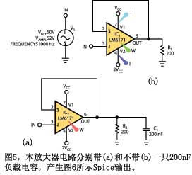 如果你能確定IC通過信號的特性,就可以用Spice來估算功耗。此時必須保證使用恰當(dāng)?shù)腟pice模型,它們對一些測試信號給出合理的結(jié)果,而功耗計算此時沒有價值。圖5表示一個Spice圖。芯片的功耗不同于到達(dá)負(fù)載的功率。圖6是圖5示意圖的Spice曲線圖。它以紅線表示啟動的振蕩。電路是否會發(fā)生這種振蕩只是個人的猜測,但它應(yīng)該會使你在建立原型后查看這種行為。記住,在OrcadCapture上點擊W鍵只能顯示芯片的靜態(tài)功耗。要獲得工作時的功耗,要用示意圖上的功率標(biāo)記,然后用曲線程序的rms-math函數(shù),給出器件的平均功耗。