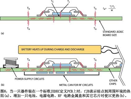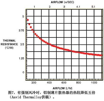 對流散熱也有一些困難。例如,氣流對商用散熱片的影響(圖7)。注意,在高溫下,熱阻會增加五倍。使用強制風(fēng)冷的散熱片有較薄、間距更近的鰭片,比如一款風(fēng)扇式CPU冷卻器。如果你的產(chǎn)品沒有風(fēng)扇,則IC產(chǎn)生的熱量會傳導(dǎo)和散播出來,然后傳送到機內(nèi)的空氣中。接下來,隨著整個機器溫度的上升,熱量通過對流傳送給周圍的空氣,如果你把機器放在腿上,則部分熱量也會傳導(dǎo)過來。外殼材料的熱阻就變得很重要。熱量從內(nèi)向外的傳送速度,塑料殼要慢于金屬殼。