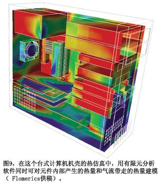 美國(guó)國(guó)家半導(dǎo)體的Webench在線設(shè)計(jì)工具采用Flomerics的Flotherm熱分析軟件,計(jì)算靜止空氣中的器件溫度。所有一般的仿真注意事項(xiàng)均適用。如果你的電路有風(fēng)扇和一些氣流,其溫升就較低。如果有機(jī)箱,里面還有其它器件,其溫升就高。Flomerics采用有限元方案技術(shù)(參考文獻(xiàn)5)。圖9顯示了一個(gè)計(jì)算機(jī)機(jī)殼發(fā)熱與氣流的分析結(jié)果。很多其它有限元解算器也可以分析這種問題。例如,Comsol的一個(gè)解算器可以完成多重物理分析,可以解算超過一個(gè)問題的偏微分方程,如一只部件的熱響應(yīng),部件的導(dǎo)熱性能隨其溫度而變化。TI的Edwards指出,他的公司提供二種級(jí)別的熱建模抽象:ΦJB熱阻,以及Delphi緊湊模型標(biāo)準(zhǔn)。Flotherm、Icepak和很多其它熱分析程序都使用這些模型?! ?br />