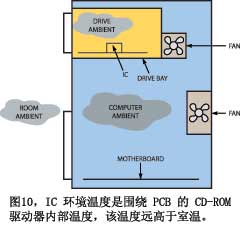 無疑,當(dāng)大多數(shù)工程師沒有理解環(huán)境溫度的嵌套程度時(shí),他們就會(huì)失敗。例如,假設(shè)要設(shè)計(jì)一個(gè)部件,用于CD播放機(jī)的光學(xué)拾取裝置(圖10)。你可能會(huì)這么假設(shè),由于該部件用于消費(fèi)產(chǎn)品,它可能工作在0℃~70℃。但好好想想吧。實(shí)驗(yàn)室工作臺(tái)上的部件可能是工作在25℃環(huán)境下。而光功率件是要安裝在CD驅(qū)動(dòng)器里,驅(qū)動(dòng)器中有其它元件在加熱空氣,該裝置可能不裝風(fēng)扇。更糟糕的是,播放機(jī)裝在計(jì)算機(jī)內(nèi),驅(qū)動(dòng)器必須工作在這種環(huán)境溫度下。計(jì)算機(jī)內(nèi)部有自己的熱源和風(fēng)扇,這個(gè)溫度上再加上外部環(huán)境溫度,因此,在工作臺(tái)上測(cè)得的25℃室溫,到了計(jì)算機(jī)內(nèi)就是40℃,CD驅(qū)動(dòng)器內(nèi)是50℃?,F(xiàn)在,如果你把計(jì)算機(jī)放在厄瓜多爾的一個(gè)很熱的閣樓上,情況又該如何?這個(gè)部件必須工作在遠(yuǎn)高于70℃的環(huán)境溫度下。你的職責(zé)是確保它仍能滿足規(guī)范,并且高溫不會(huì)顯著縮短產(chǎn)品的壽命。