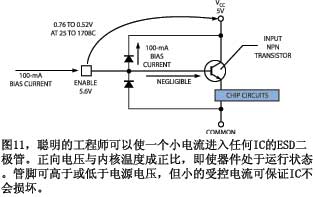 即使當(dāng)器件在電路中工作時(shí),許多聰明的半導(dǎo)體制造商都會(huì)自己測(cè)量?jī)?nèi)核本身溫度,他們用的是一片IC的每個(gè)輸入、輸出和控制腳上都有的ESD(靜電放電)二極管(圖11)。你可以將這種方法用于有復(fù)位或CS(片選)腳的IC,也可以用多個(gè)其它腳作測(cè)量。由于二極管的正向壓降與電流成正比,你可以將芯片放入烤箱,使小電流通過ESD二極管。業(yè)內(nèi)很多人認(rèn)為,100mA的電流不會(huì)造成二極管的任何自熱現(xiàn)象。你不需要為部件加電來測(cè)量二極管電壓,你可以用電源腳上或接地腳下的任何輸入或輸出腳。管腳內(nèi)部的ESD二極管會(huì)將該腳箝位在大約0.6V。如果是復(fù)位腳,它需要在部件工作時(shí)保持高電平,則將該腳上拉到電源腳。當(dāng)烤箱溫度上升時(shí),ESD二極管的正向壓降從大約0.7V降到0.53V。