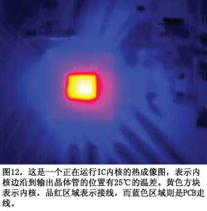 有關(guān)ESD二極管方法的另一個(gè)擔(dān)心是,IC芯片并不是等溫的,即它們?cè)诳臻g和時(shí)間上都不具備相等或恒定溫度。測(cè)量ESD二極管時(shí)并不能永遠(yuǎn)保證測(cè)到的是內(nèi)核的最熱點(diǎn)。這里關(guān)注的是ESD二極管,它總是在芯片的邊沿,低于輸出晶體管的溫度。你可以獲得IC工作時(shí)的IR熱成像圖(圖12)。圖中明亮的白點(diǎn)比ESD二極管所在的內(nèi)核邊沿高25℃。當(dāng)器件工作在高溫下時(shí),可能需要降級(jí)使用(參考文獻(xiàn)8)。在150℃時(shí),器件可能不能滿足電路的要求。