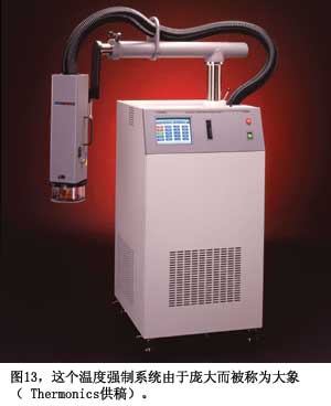 做測(cè)量只是檢查真實(shí)情況,驗(yàn)證自己的假設(shè)與估算的一個(gè)部分。如果沒有可用的環(huán)境溫度,你還必須自己創(chuàng)造出來。汽車公司會(huì)在亞利桑那州和加拿大做跟蹤測(cè)試,對(duì)于電子測(cè)試,采用臺(tái)面測(cè)試室或溫度強(qiáng)制系統(tǒng),如Thermonics的T-2500E型(圖13)。要確保使用的電纜和測(cè)試線可以承受熱量。BrownBNC電纜有較高的額定溫度,優(yōu)于更常用的黑色U58型線(參考文獻(xiàn)9)。熱風(fēng)槍的快速氣流就可以加熱IC,但要小心,IC可能很容易被熱風(fēng)槍毀壞。制